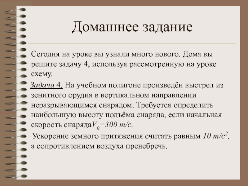 Задача 4. На учебном полигоне произведён выстрел из зенитного орудия в вертикальном направлении неразрывающимся снарядом. Требуется определить наибольшую высоту подъёма снаряда, если начальная скорость снарядаV0=300 m/c.