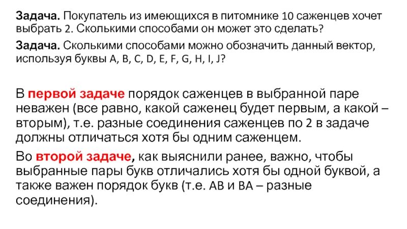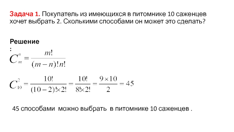 Слайд 4Задача. Покупатель из имеющихся в питомнике 10 саженцев хочет выбрать 2.