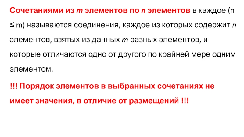 m) называются соединения, каждое из которых содержит n элементов, взятых из данных m разных элементов, и которые отличаются одно от другого по крайней мере одним элементом.