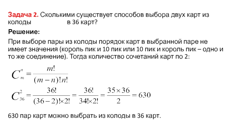 Слайд 10Задача 2. Сколькими существует способов выбора двух карт из колоды