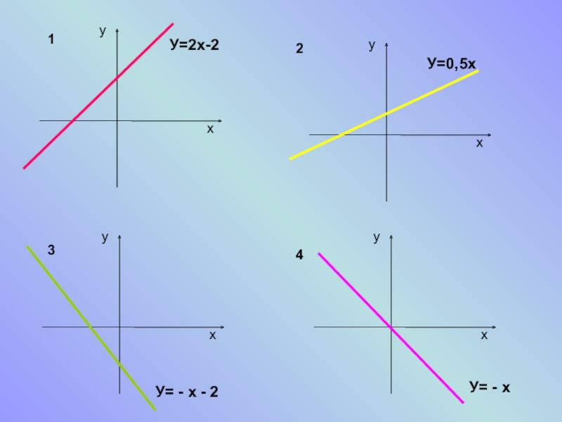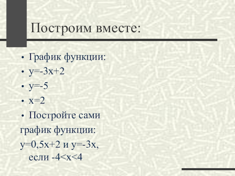 Построим вместе:График функции:у=-3х+2у=-5х=2Постройте самиграфик функции:у=0,5х+2 и у=-3х, если -4