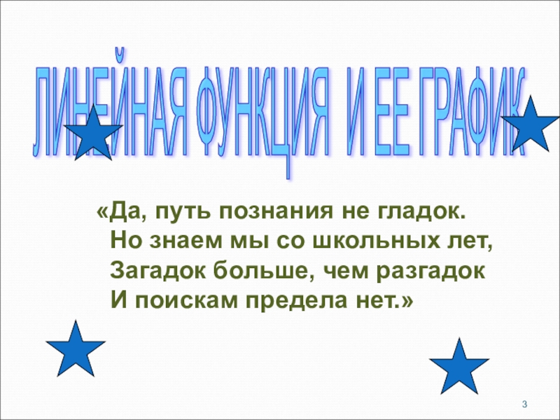 ЛИНЕЙНАЯ ФУНКЦИЯ И ЕЕ ГРАФИК «Да, путь познания не гладок. Но знаем мы со школьных лет, Загадок
