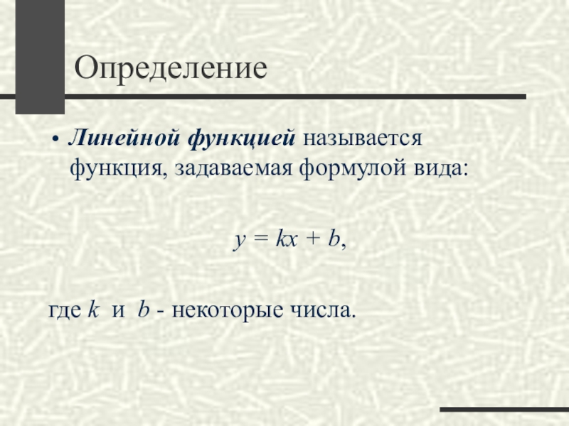 ОпределениеЛинейной функцией называется функция, задаваемая формулой вида:  y = kx + b, где k  и  b -