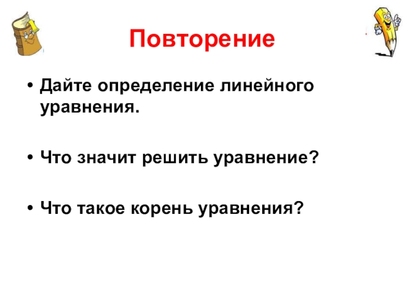 Повторение Дайте определение линейного уравнения.Что значит решить уравнение?Что такое корень уравнения?