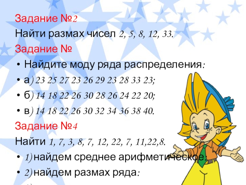 Задание №2Найти размах чисел 2, 5, 8, 12, 33.Задание №Найдите моду ряда распределения:а) 23 25 27 23