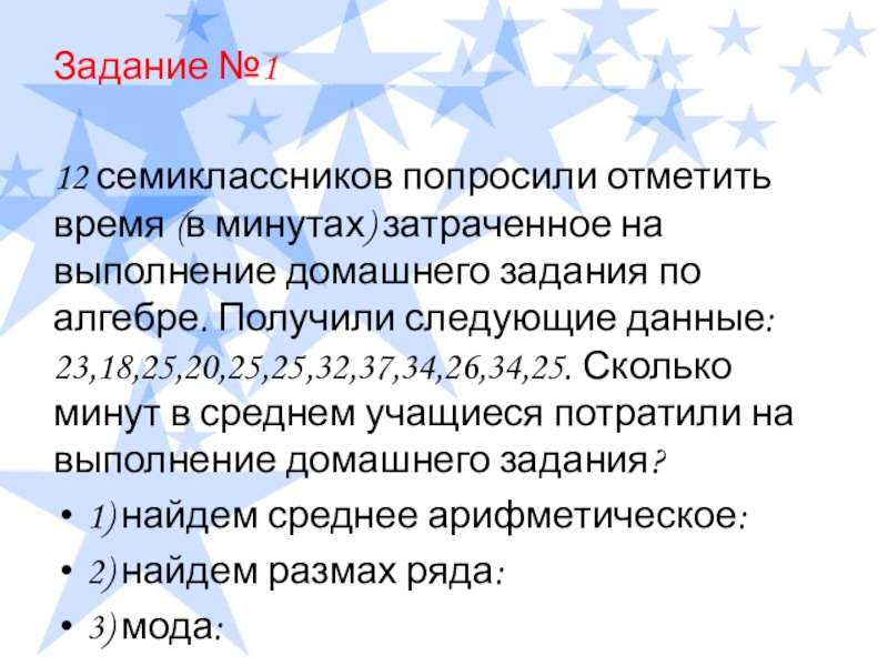 домашнего задания по алгебре. Получили следующие данные: 23,18,25,20,25,25,32,37,34,26,34,25. Сколько минут в среднем учащиеся потратили на выполнение домашнего задания?