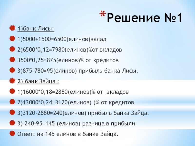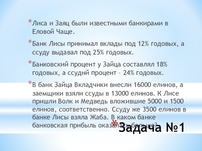 В банк Зайца Вкладчики внесли 16000 елинов, а заемщики взяли ссуды в 13000 елинов. К Лисе пришли Волк и Медведь вложившие 5000 и 1500 елинов, соответственно. Ссуду же 3500 елинов в банке Лисы взяла Жаба. В каком банке банковская прибыль оказалась больше?