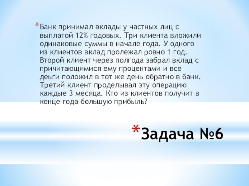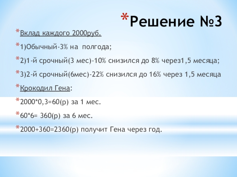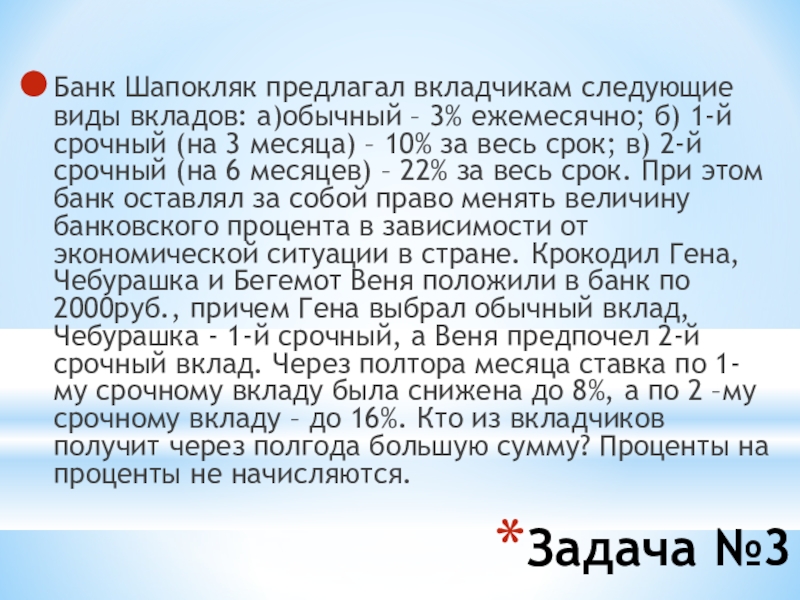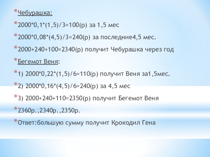 ежемесячно; б) 1-й срочный (на 3 месяца) – 10% за весь срок; в) 2-й срочный (на 6 месяцев) – 22% за весь срок. При этом банк оставлял за собой право менять величину банковского процента в зависимости от экономической ситуации в стране. Крокодил Гена, Чебурашка и Бегемот Веня положили в банк по 2000руб., причем Гена выбрал обычный вклад, Чебурашка - 1-й срочный, а Веня предпочел 2-й срочный вклад. Через полтора месяца ставка по 1-му срочному вкладу была снижена до 8%, а по 2 –му срочному вкладу – до 16%. Кто из вкладчиков получит через полгода большую сумму? Проценты на проценты не начисляются.