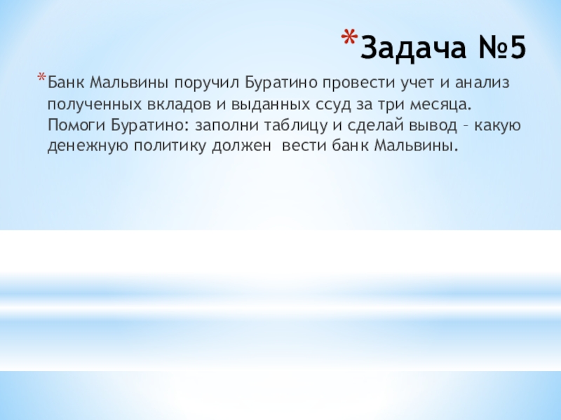 и выданных ссуд за три месяца. Помоги Буратино: заполни таблицу и сделай вывод – какую денежную политику должен вести банк Мальвины.