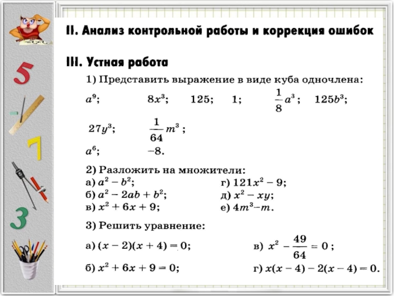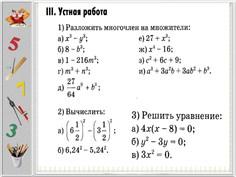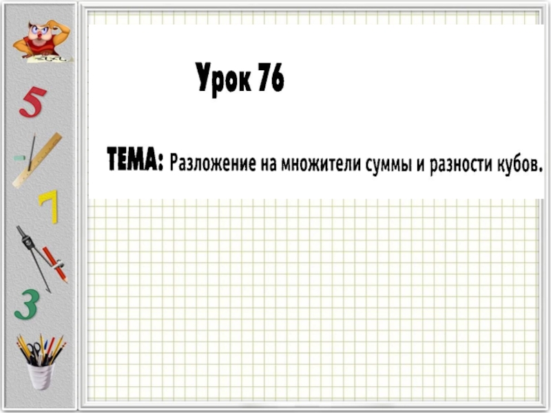 Презентация, доклад по алгебре 7 класс Разложение на множители суммы и разности кубов.