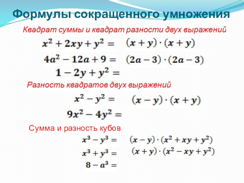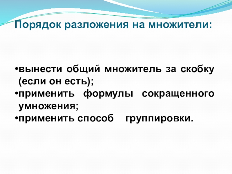 Порядок разложения на множители: вынести общий множитель за скобку(если он есть);применить формулы сокращенного умножения;применить способ  группировки.