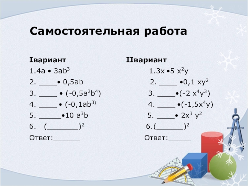 3. ____ • (-0,5а2b4) 3. ____•(-2 х4у3)