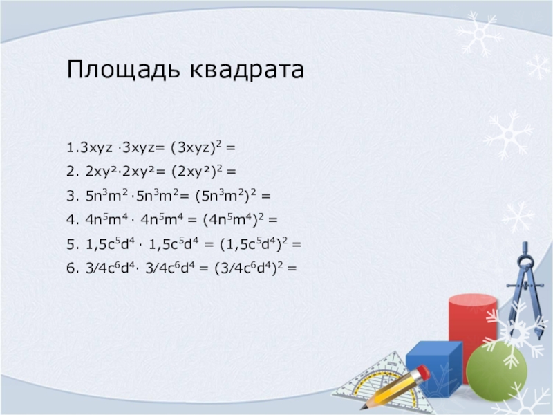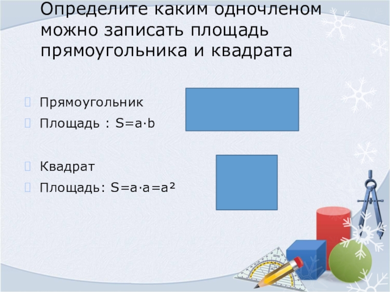 Слайд 5Определите каким одночленом можно записать площадь прямоугольника и квадрата
