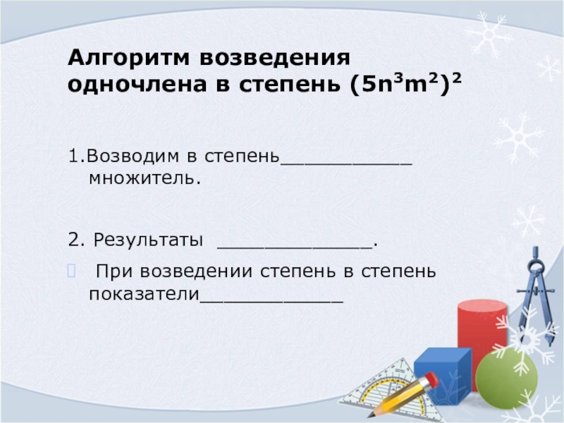 Слайд 12Алгоритм возведения одночлена в степень (5n3m2)2