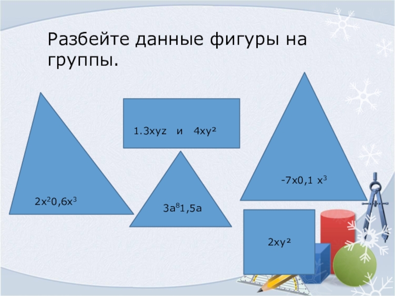 Слайд 4Разбейте данные фигуры на группы.