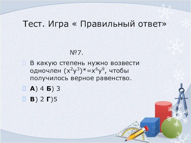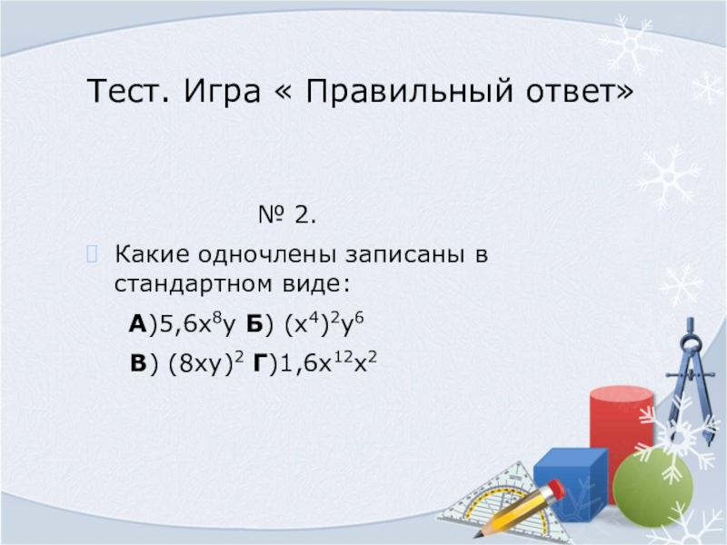 Слайд 20Тест. Игра « Правильный ответ»