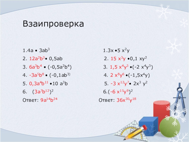 4. -3а5b8 • (-0,1ab3) 4. 2 х8у6 •(-1,5х4у)