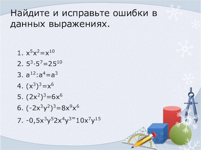 Слайд 2Найдите и исправьте ошибки в данных выражениях.