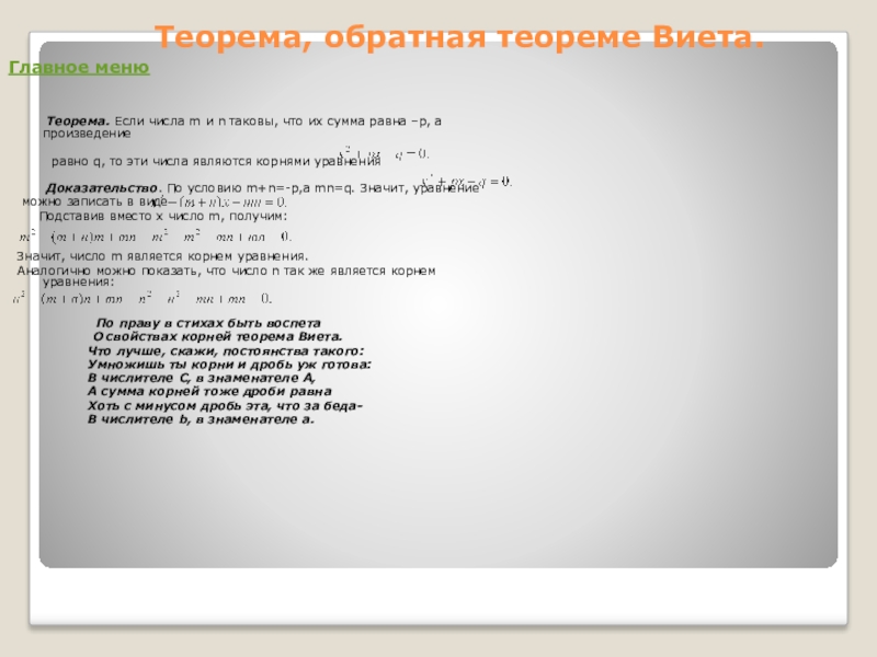 Теорема. Если числа m и n таковы, что их сумма равна –p, а произведение