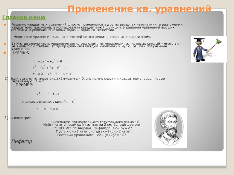 Решение квадратных уравнений широко применяется в других разделах математики: в разложении квадратного трехчлена, в исследовании квадратичной функции, в решении уравнений высших степеней, в решении текстовых задач и задач по геометрии.