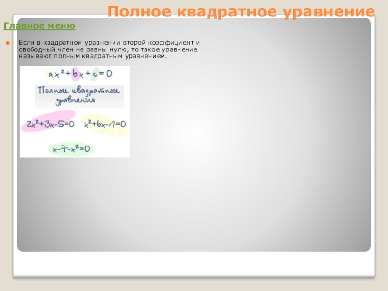 Если в квадратном уравнении второй коэффициент и свободный член не равны нулю, то такое уравнение называют полным квадратным уравнением.