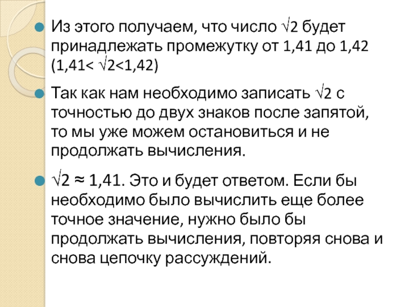 √2 ≈ 1,41. Это и будет ответом. Если бы необходимо было вычислить еще более точное значение, нужно было бы продолжать вычисления, повторяя снова и снова цепочку рассуждений.