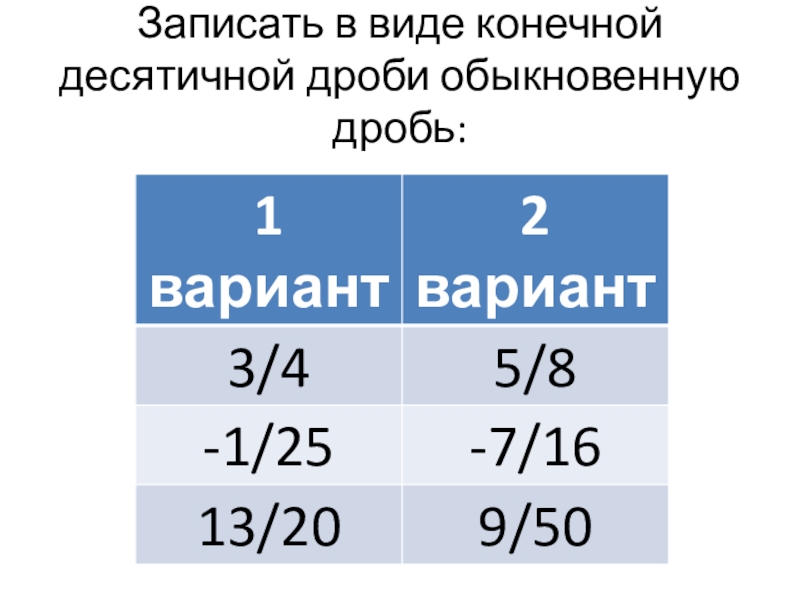 Слайд 2Записать в виде конечной десятичной дроби обыкновенную дробь: