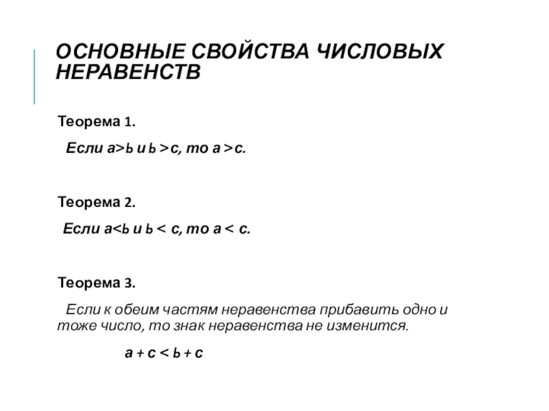 ОСНОВНЫЕ СВОЙСТВА ЧИСЛОВЫХ НЕРАВЕНСТВТеорема 1.  Если а>b и b >с, то а >с.Теорема 2.  Если