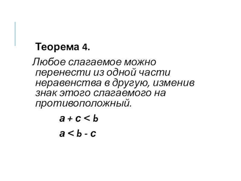 Теорема 4.  Любое слагаемое можно перенести из одной части неравенства в другую, изменив знак этого слагаемого
