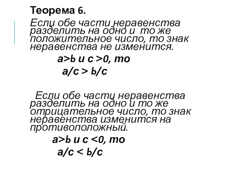 Теорема 6.  Если обе части неравенства разделить на одно и то же положительное число, то знак