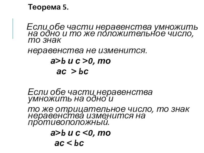 Теорема 5.  Если обе части неравенства умножить на одно и то же положительное число, то знак