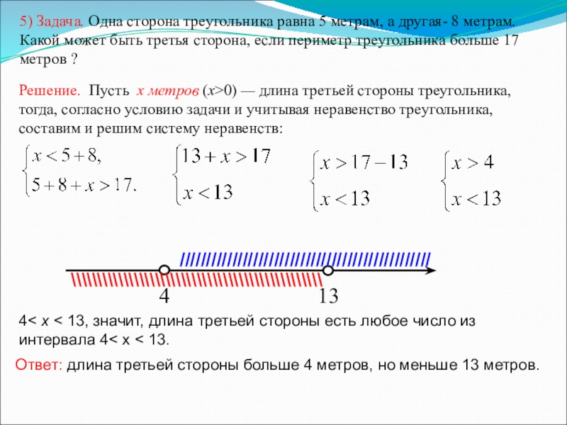 Решение. Пусть x метров (x>0) — длина третьей стороны треугольника, тогда, согласно условию задачи и учитывая неравенство треугольника, составим и решим систему неравенств: