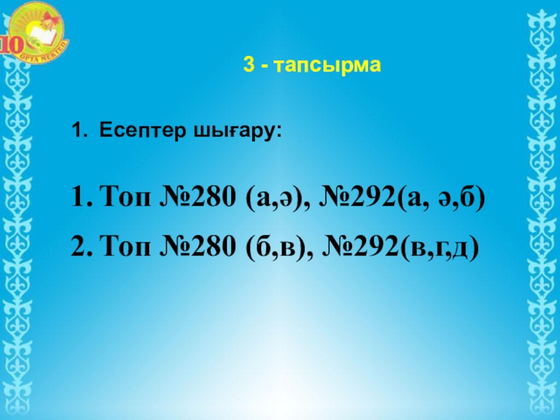 Топ №280 (а,ә), №292(а, ә,б)Топ №280 (б,в), №292(в,г,д)3 - тапсырмаЕсептер шығару: