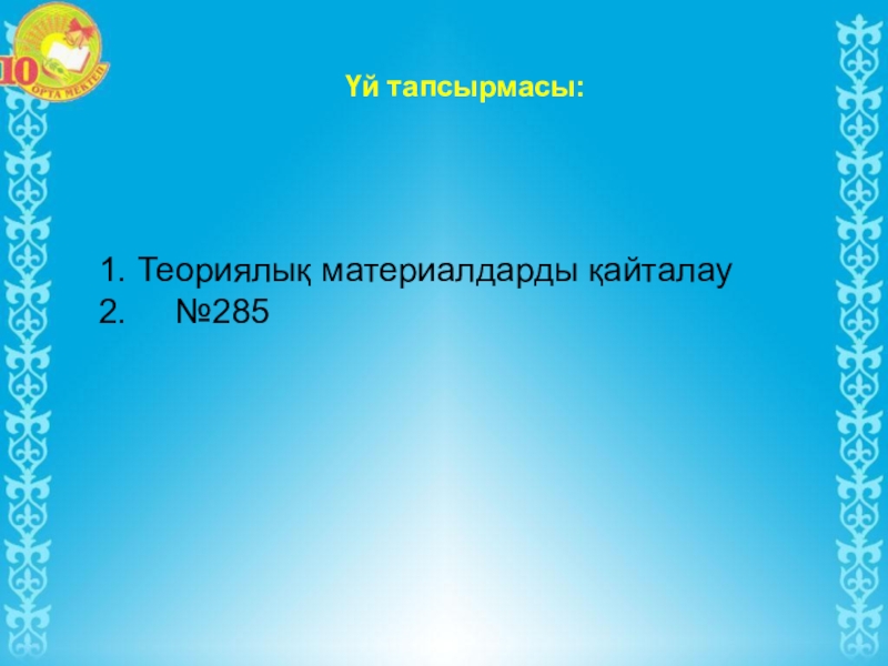 Үй тапсырмасы: 1. Теориялық материалдарды қайталау 2.   №285