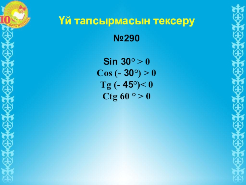 Үй тапсырмасын тексеру№290 Sin 30° > 0Cos (- 30°) > 0Tg (- 45°)< 0Ctg 60 ° > 0