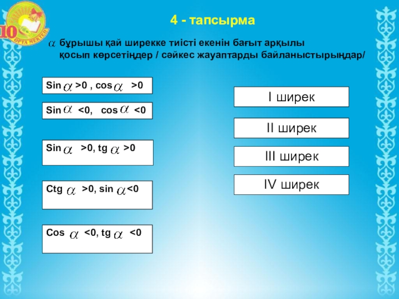 4 - тапсырма бұрышы қай ширекке тиісті екенін бағыт арқылы қосып көрсетіңдер / сәйкес жауаптарды байланыстырыңдар/І ширекІІ