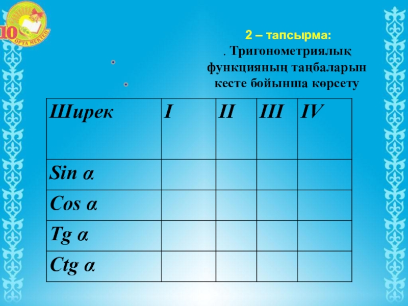 2 – тапсырма:. Тригонометриялық функцияның таңбаларын кесте бойынша көрсету
