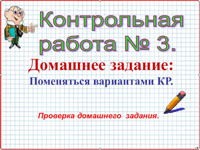 Контрольная  работа № 3.Домашнее задание:Поменяться вариантами КР.Проверка домашнего задания.