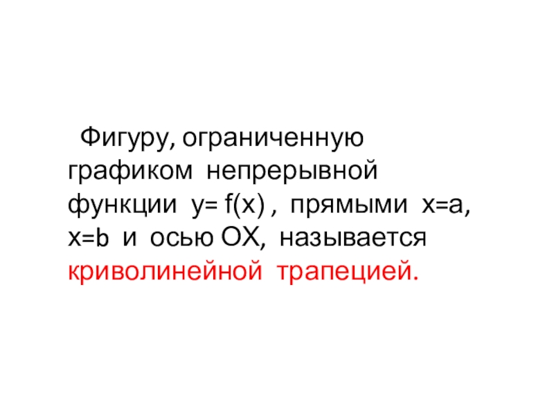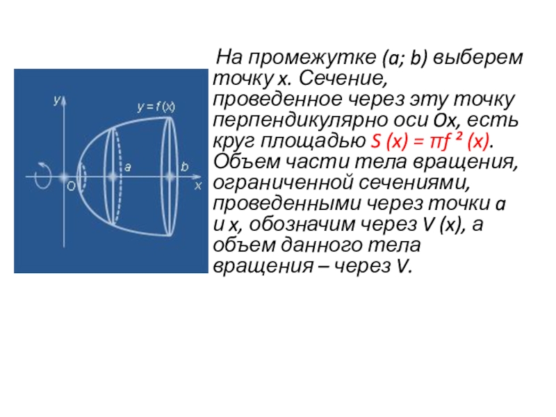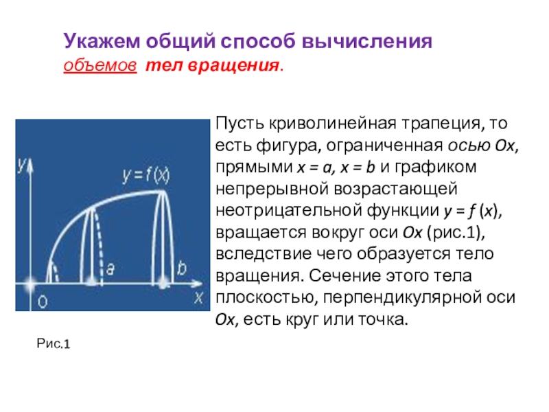 Пусть криволинейная трапеция, то есть фигура, ограниченная осью Ox, прямыми x = a, x = b и графиком непрерывной возрастающей неотрицательной функции y = f (x), вращается вокруг оси Ox (рис.1), вследствие чего образуется тело вращения. Сечение этого тела плоскостью, перпендикулярной оси Ox, есть круг или точка.