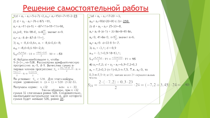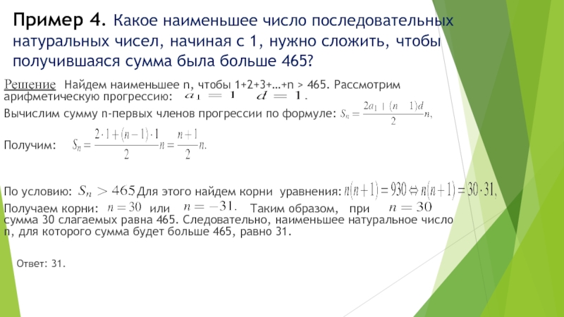 Решение Найдем наименьшее n, чтобы 1+2+3+…+n > 465. Рассмотрим арифметическую прогрессию:
