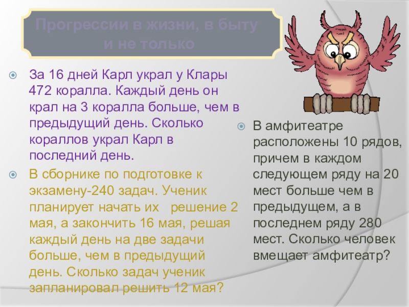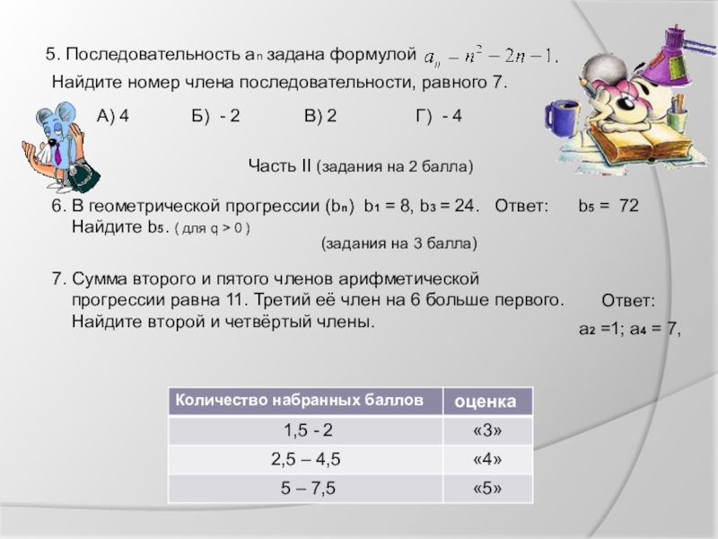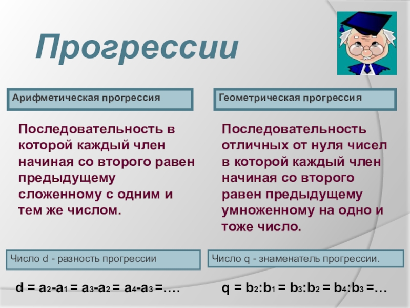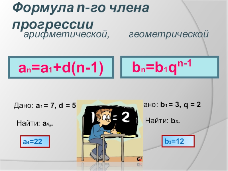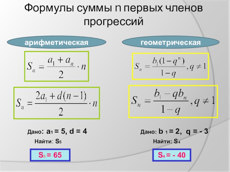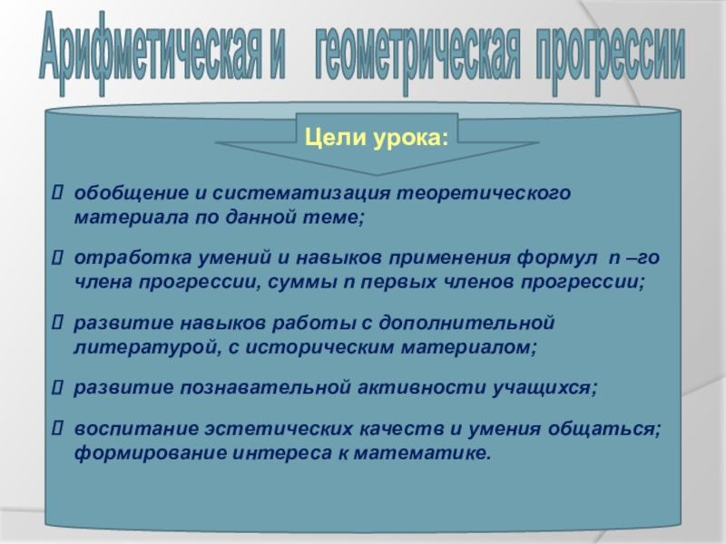 отработка умений и навыков применения формул n –го члена прогрессии, суммы n первых членов прогрессии;
