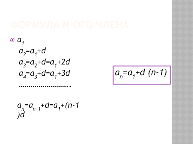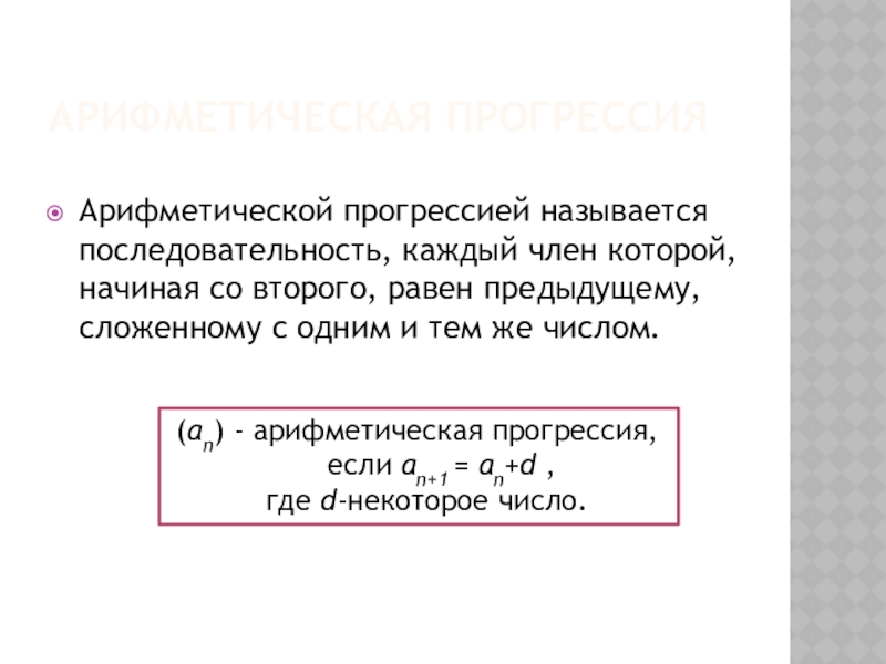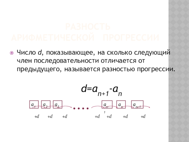 Число d, показывающее, на сколько следующий член последовательности отличается от предыдущего, называется разностью прогрессии.