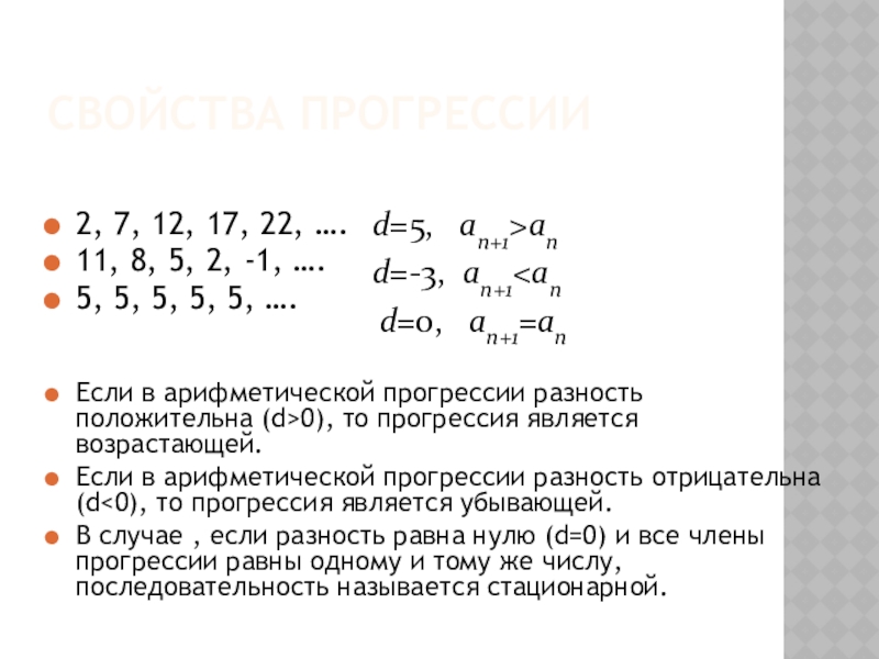 В случае , если разность равна нулю (d=0) и все члены прогрессии равны одному и тому же числу, последовательность называется стационарной.