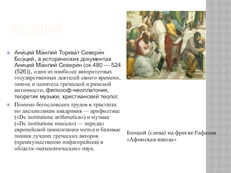 Боэций (слева) на фреске Рафаэля «Афинская школа»