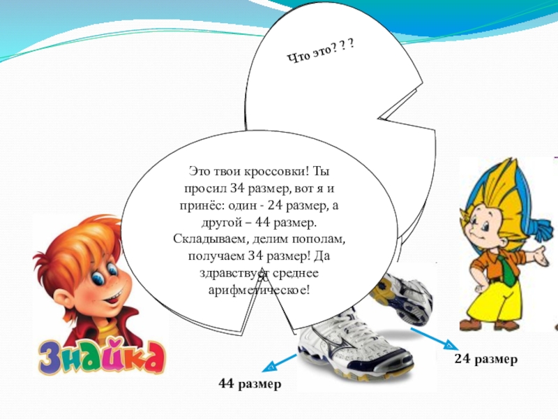 Это твои кроссовки! Ты просил 34 размер, вот я и принёс: один - 24 размер, а другой – 44 размер. Складываем, делим пополам, получаем 34 размер! Да здравствует среднее арифметическое!