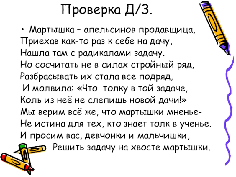 Проверка Д/З.Мартышка – апельсинов продавщица,Приехав как-то раз к себе на дачу, Нашла там с радикалами задачу.Но сосчитать