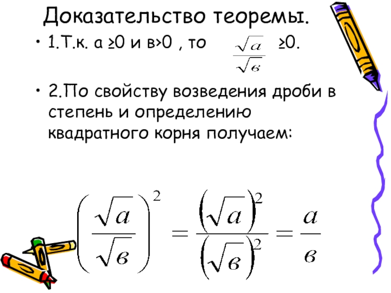 Доказательство теоремы.1.Т.к. а ≥0 и в›0 , то       ≥0.2.По свойству возведения