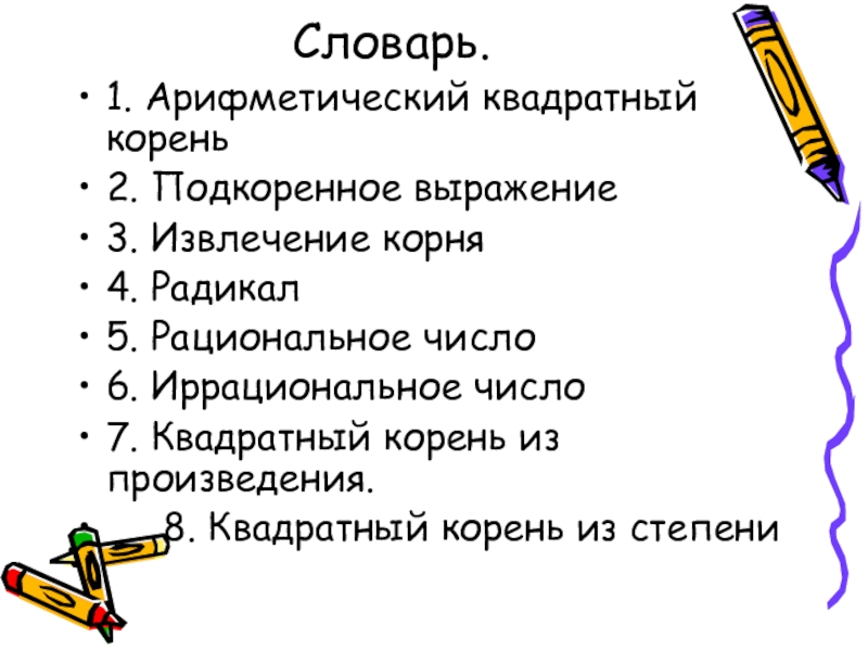 Словарь.1. Арифметический квадратный корень2. Подкоренное выражение3. Извлечение корня4. Радикал5. Рациональное число6. Иррациональное число7. Квадратный корень из произведения.