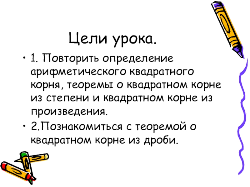 Цели урока.1. Повторить определение арифметического квадратного корня, теоремы о квадратном корне из степени и квадратном корне из