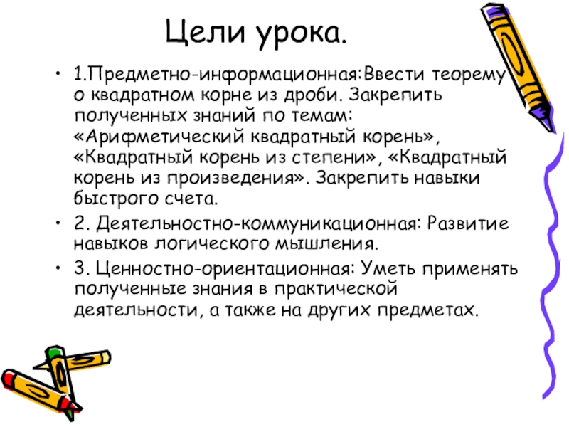 1.Предметно-информационная:Ввести теорему о квадратном корне из дроби. Закрепить полученных знаний